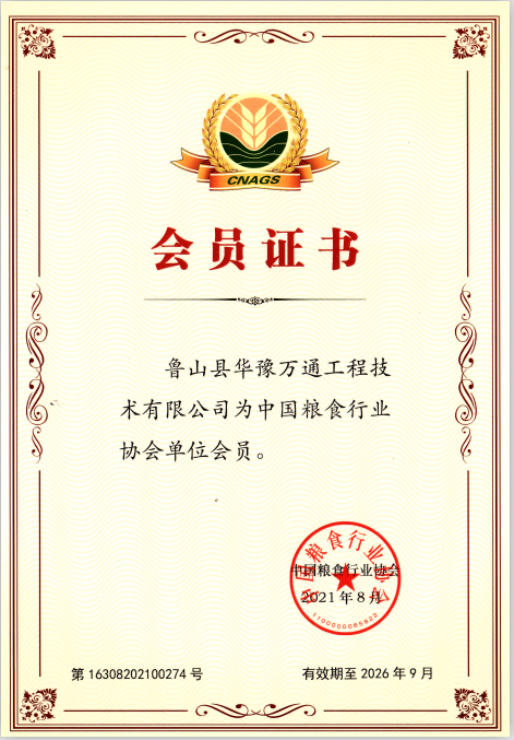 中國糧食行業(yè)協(xié)會(huì)經(jīng)多方考察和論證,于2021年8月份正式吸納魯山縣華豫萬通工程技術(shù)有限公司為會(huì)員單位。