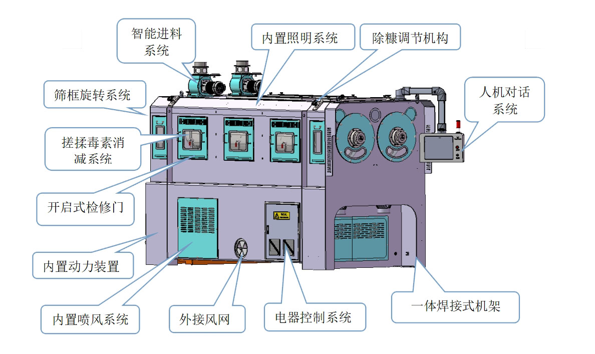 2、差速逆向金剛石搓板搓揉結(jié)構(gòu):物料經(jīng)機械推動,高密度揉搓室及負壓的作用下,使附著在物料表面的真菌毒素分離并排出機外。